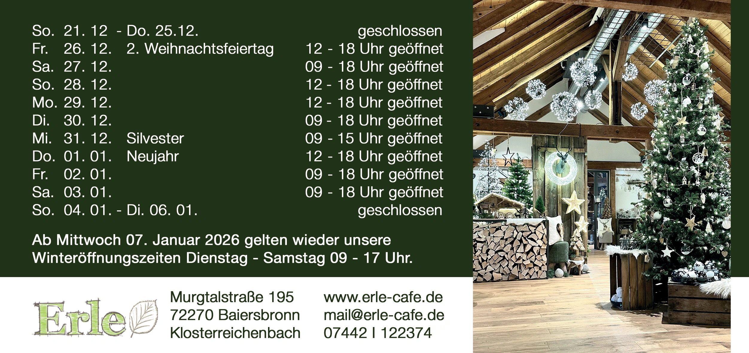 Wir freuen uns darauf, Sie in unserem Café begrüßen zu dürfen und Ihnen den Aufenthalt in der Erle zu einer besonderen Zeit zu machen.