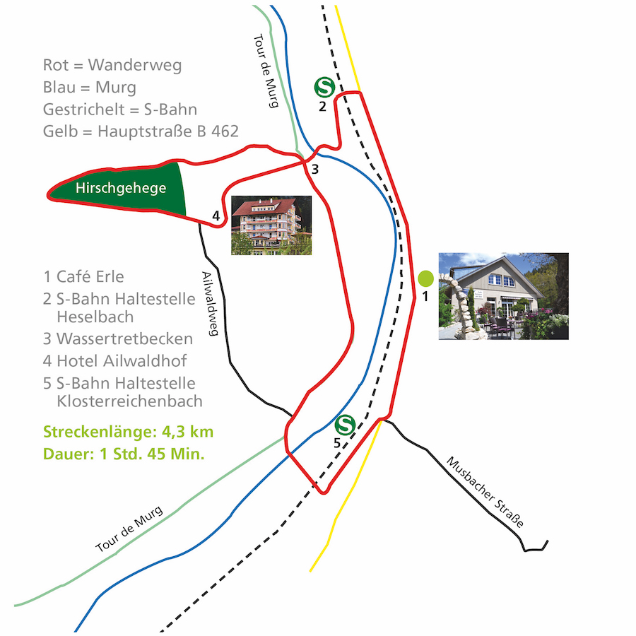 Von der Erle aus führt der Wanderweg bis zum Heselsbacher Bahnhof, dann über die Murg zur Wassertretanlage. Von hier aus geht's am Schützenhaus vorbei hoch zum Leimenbuckel, ums Wildgehege herum, am Hotel Ailwaldhof/Ailwaldsee vorbei und zurück entlang der Tour de Murg.