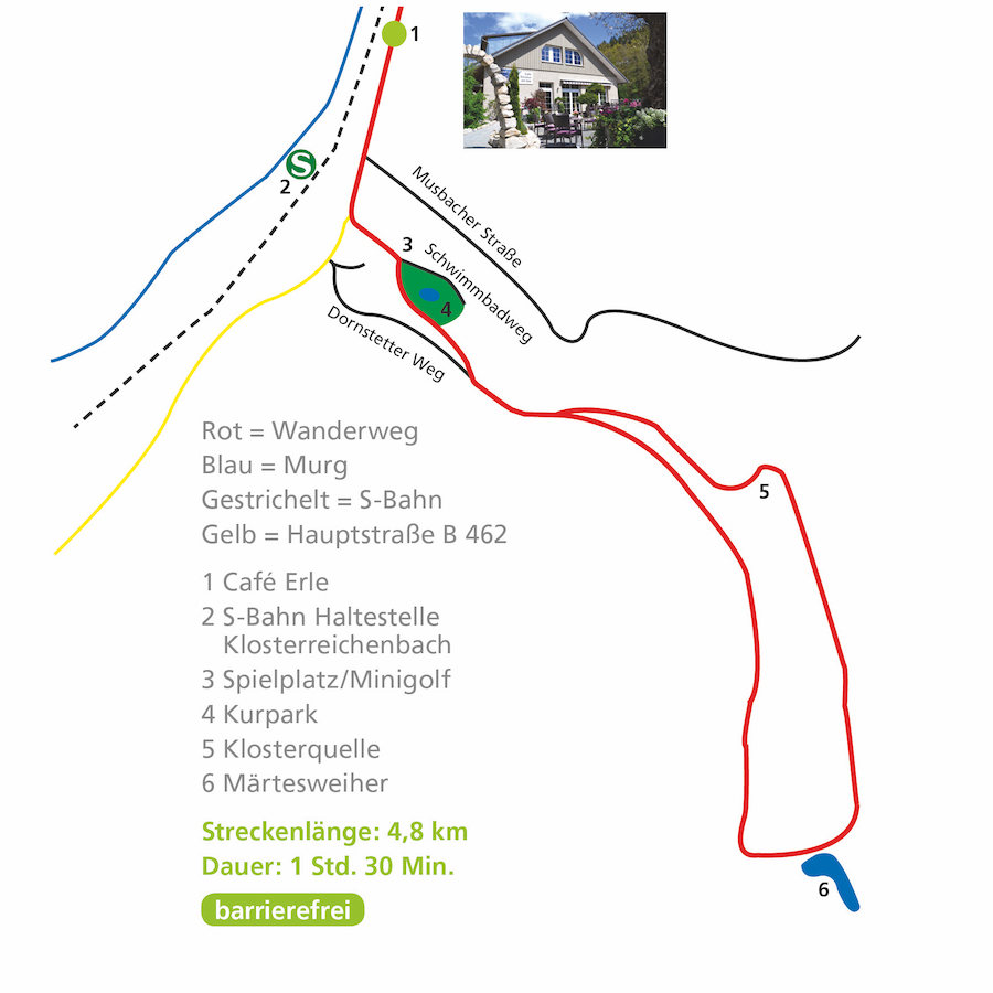 In Klosterreichenbach angekommen, geht es über die Murgbrücke, am Klosterreichenbacher Bahnhof vorbei zurück zum Ausgangspunkt Café Erle.