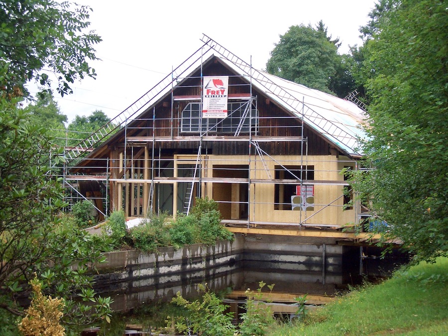 Aus dem angrenzenden Klotz-Weiher wurden die Baumstämme in das Sägewerk gezogen und dann zu Balken und Brettern verarbeitet. Das Sägegatter, das mit Wasserkraft betrieben wurde, befand sich mitten im heutigen Café.